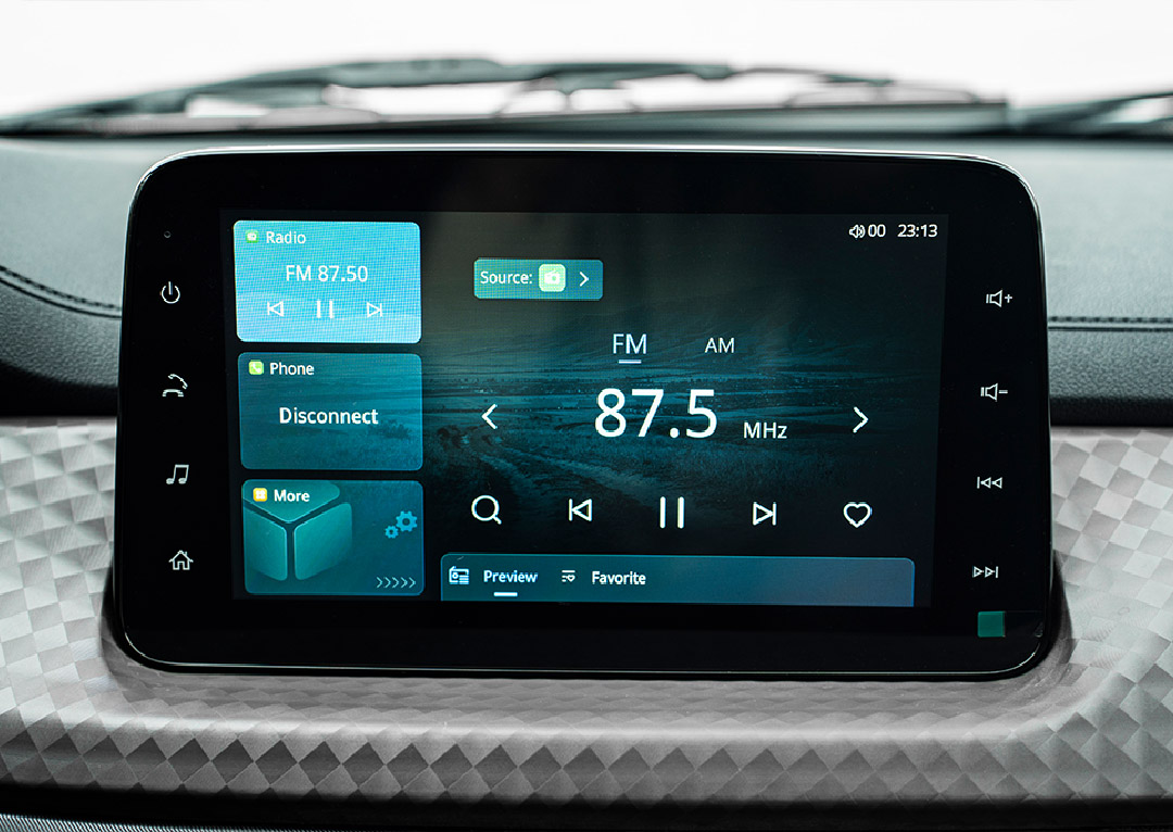 Équipement et technologie efficaces. Écran couleur 10 pouces mp5 et panneau d'accès, connectivité via ports USB et auxiliaires.